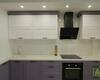 В качестве оформления кухни используются крашеные фасады из МФД. Окрашена она в сиреневый и белый цвет. Такая комбинация цветов выбрана не просто, так как они позволяют создать мягкий интерьер, который успокаивает и располагает к приготовлению блюд. Для усиления соответствующей атмосферы было принято решение добавить мягкое освещение, располагающееся по периметру.