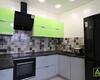 Современная кухня выполнена в популярном цветовом сочетании. Фасад имеет черный, серый и салатовые оттенки, которые в совокупности дают невероятный дизайн. Это современная кухня, которая отлично подойдет под любой дизайн квартиры или частного дома. Нижние фасады выполнены вы сером цвете, верхние в салатовом, столешница и скинали в черном. Все вместе смотрится очень оригинально и привлекает к себе массу внимания, вы можете быть уверенными в том, что любой гость на вашей кухне обратит внимание на дизайнерское решение и будет положительно удивлен этому.